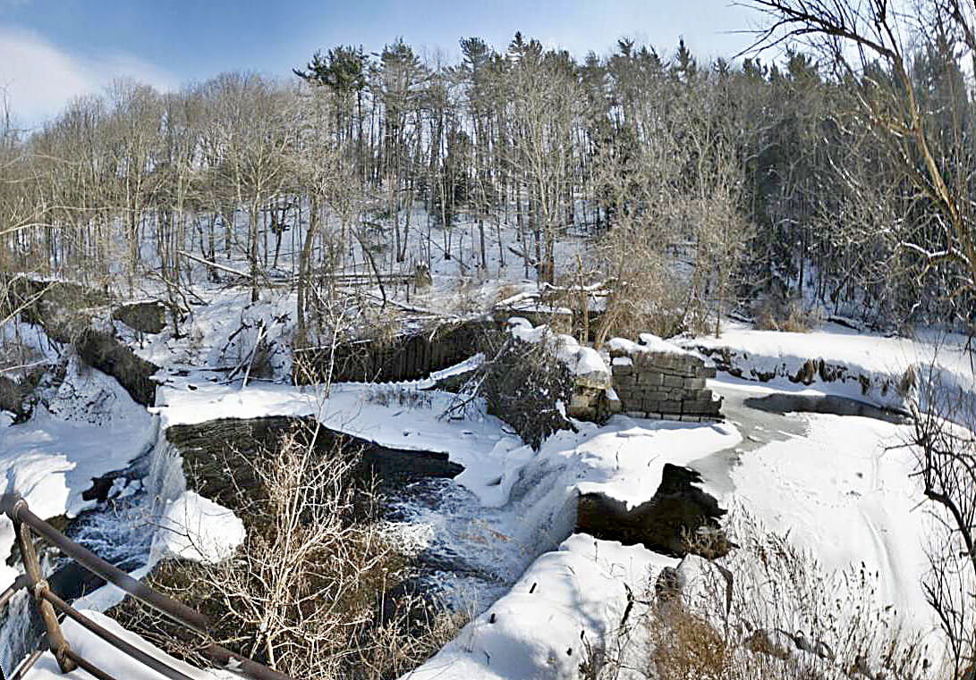 Snow, Ice and water define the double falls alongside the Seneca Mills ruins.
