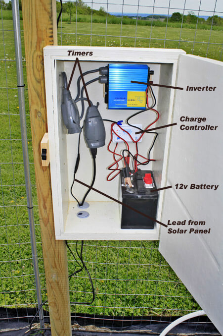 I selected components that could support several pumps if we decide to expand beyond the two 20-pot setups we have now. The battery is a unit typical in small lawn tractors. I chose a 15 watt solar panel that is used to trickle charge car batteries. A charge controller manages the output from the solar panel to keep the battery safely charged. Finally, a device called an inverter takes the 12 volts direct current from the battery and puts out 120 volts alternating current that the pumps require. With a steady power supply we can have timers to control the pumps, making the routine operation automatic.