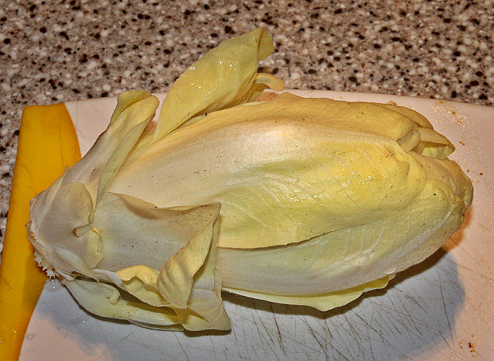 The witloof roots had been pack away in a warm corner next to the furnace, and after four weeks I had a couple of buds, or chicons, ready to use. One was about twice the size of the ones you find in the grocery store. I decided that it could be split and braised to be a side dish with dinner.